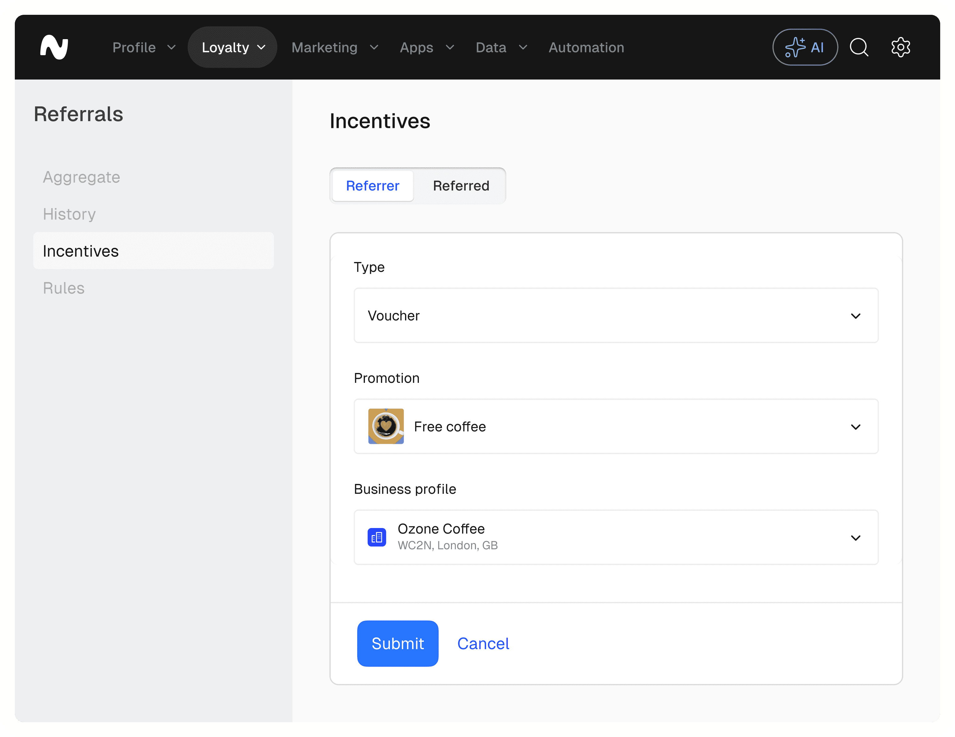 Choose what each side earns, such as vouchers, credit, gift cards, points, or custom rewards. Define reward values, usage limits, and expiry rules.