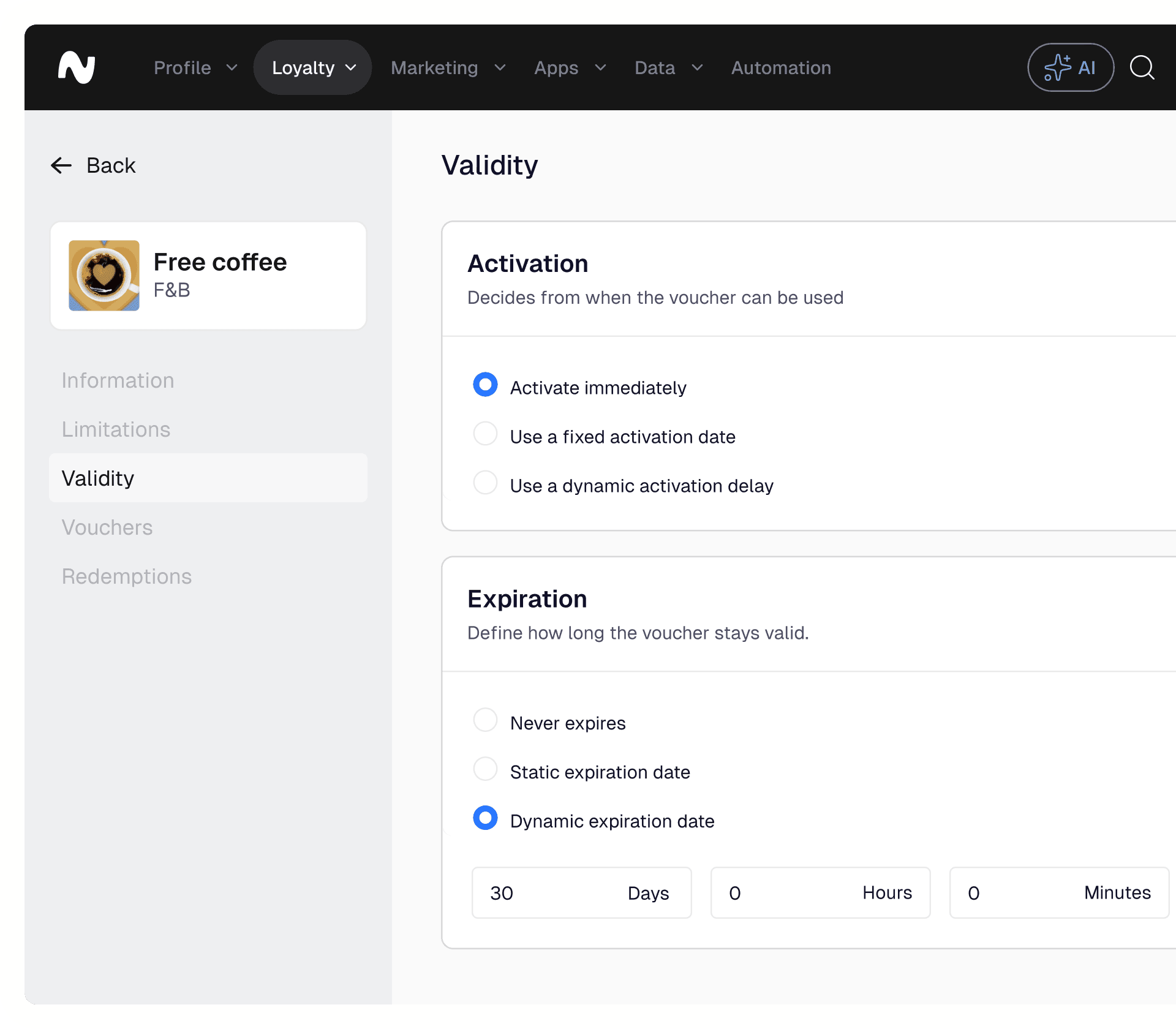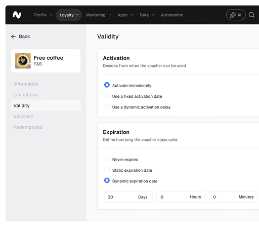 Define the voucher type, rules, and validity from one central place.