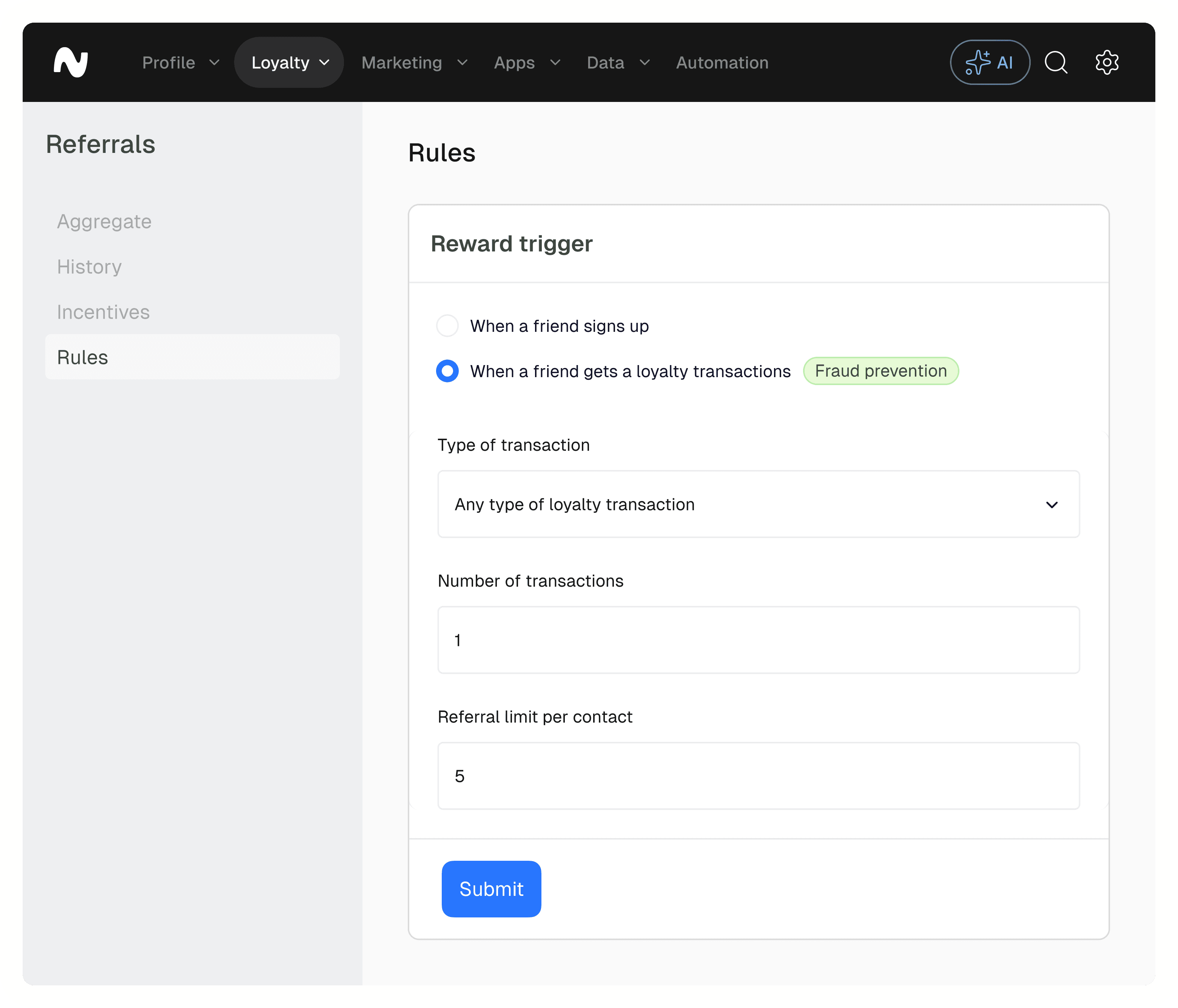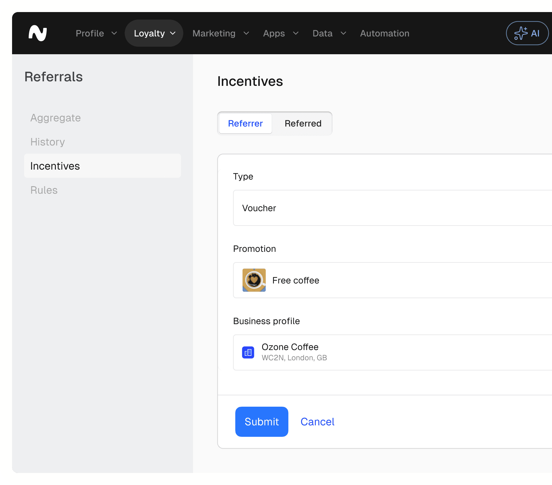 Choose what each side earns, such as vouchers, credit, gift cards, points, or custom rewards. Define reward values, usage limits, and expiry rules.