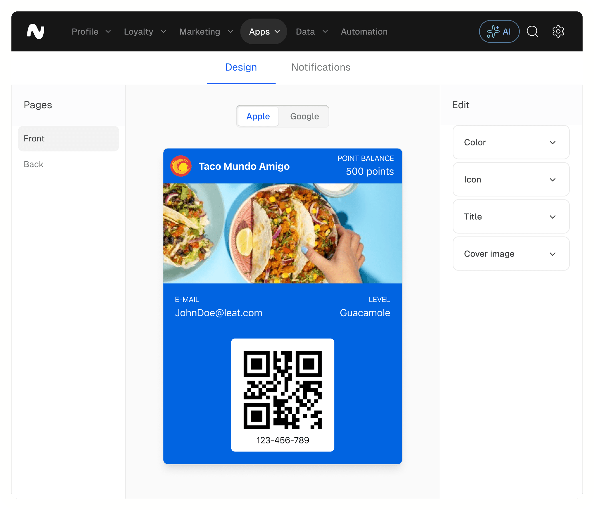 Select exactly what customers should see on the pass, such as points, credit, tier level, membership status, rewards, and the barcode or QR scan method. All data stays in sync with your Leat platform in real time.